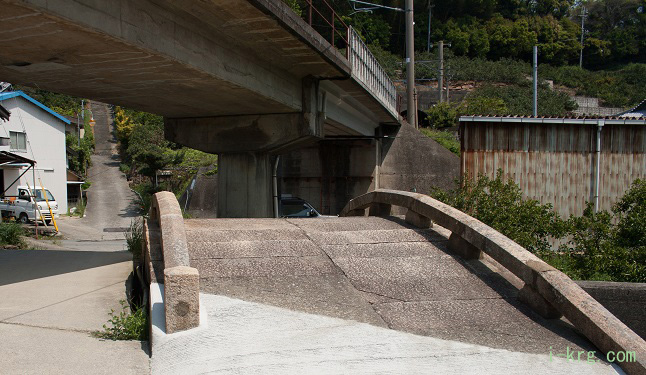 反橋に目を向けると、電車の高架下で窮屈になって、申し訳なさそうな感じに架かっている。