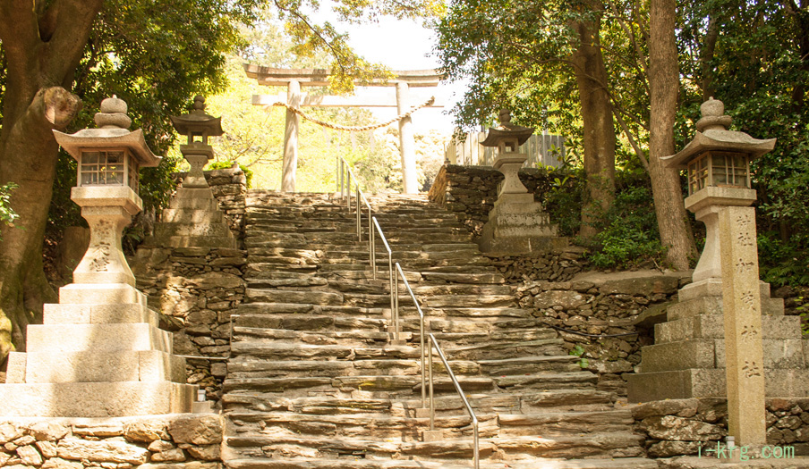 神社に続く階段の先は、木々のトンネルではっきり見えない。